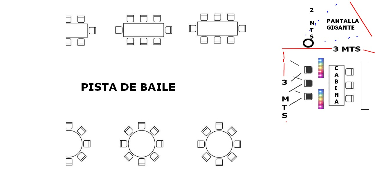 EL ESPACIO (AL FINAL O PRINCIPIO DE LA PISTA debe contar con COMO MINIMO por favor con unos 3 metros de ancho X 3 metros de largo – y siempre pedimos 2 sillitas en el espacio asignado para EL ENTRETENIMIENTO DE LA FIESTA (o sea: para la cabina de DJ)